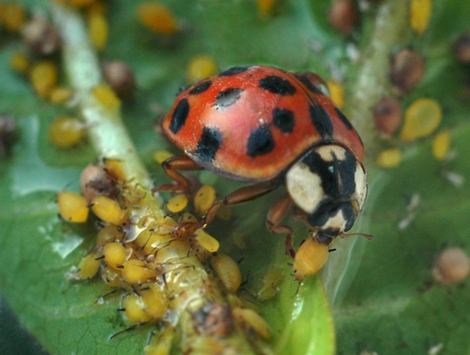붉은 등갑 7점 무당벌레는 하루 400마리 이상의 진딧물을 잡아 먹는다. 무당벌레가 살 수 있는 환경을 만들어 주면 친환경 진딧물 제거에 큰 도움을 준다.