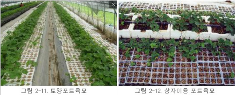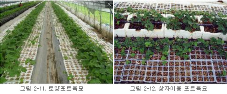 딸기 포트육묘는 꽃눈분화 촉진, 증수, 병해경감 등의 측면에서 토경육묘보다 유리한 점이 있어 최근에는 많이 이용되고 있다.