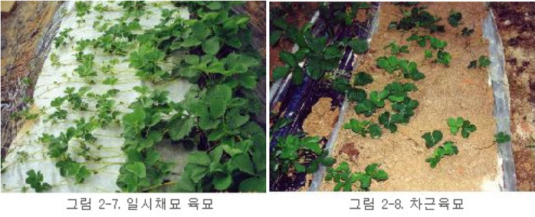 차근육묘란 비닐이나 부직포 등을 이용하여 토양에 멀칭하고 그 위에 흙이나 상토, 왕겨 등을 5㎝이상 복토하여 런너를 유인 발근시키는 방법이다.