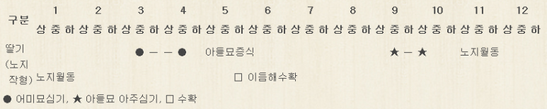 - 작형조합 : 초촉성(11월 수확) + 촉성(12월 수확) 또는 촉성 + 반촉성