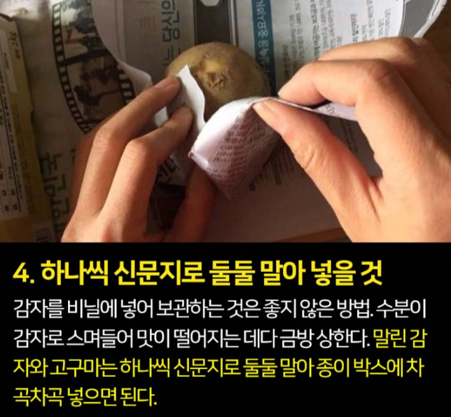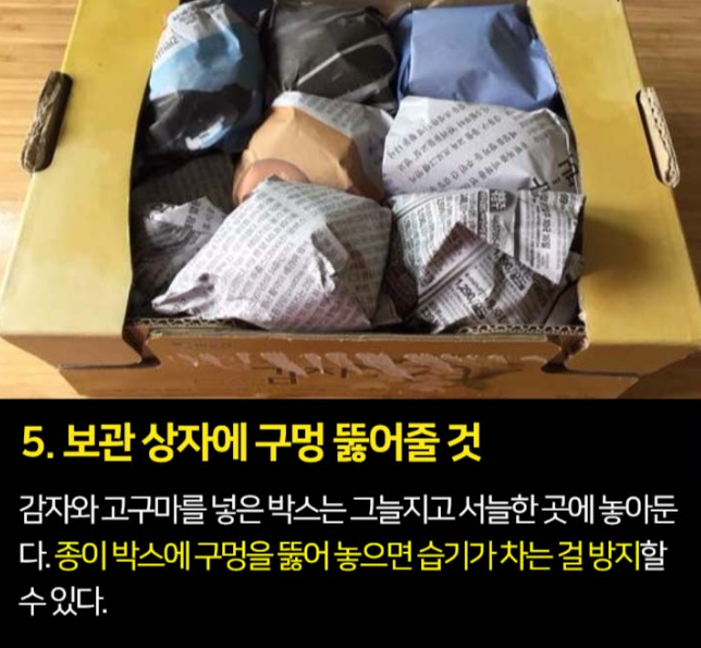 감자는 쉽게 상하기 때문에, 가정에서 오래 보관하기가 쉽지 않다. 신문지에 싸서 김치냉장고 같은 곳에 보관하면 괜찮다고 생각할지 모르지만, 오래 보관하지 않는 것이 좋다.