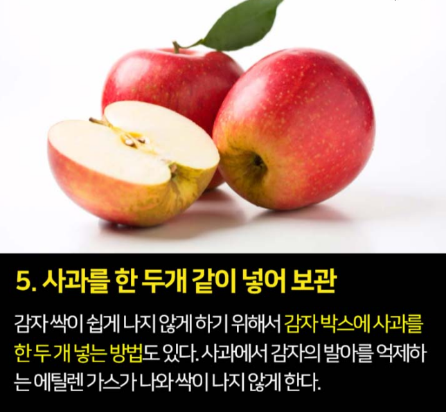 사과와 함께 감자를 보관하면 오래 보관할 수 있다. 감자를 보관하는 박스에 사과를 한두 개 넣어주는 것이다. 사과에서 감자의 발아를 억제하는 가스인 에틸렌이 나와서 싹을 틔우지 못하게 하므로 오랜 시간 보관이 가능하다.