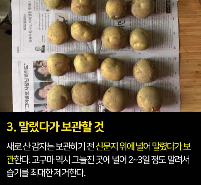 감자는 쉽게 상하기 때문에, 가정에서 오래 보관하기가 쉽지 않다. 신문지에 싸서 김치냉장고 같은 곳에 보관하면 괜찮다고 생각할지 모르지만, 오래 보관하지 않는 것이 좋다.
