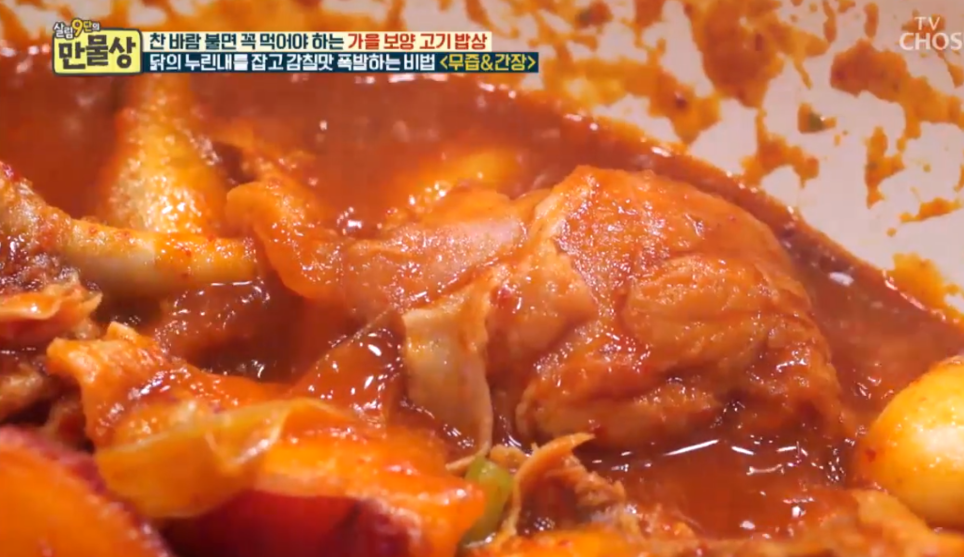 '만물상' 닭볶음탕을 만들 때 무의 매운 맛을 내는 이소시아네이트 성분이 누린내를 잡고 간장의 단백질 성분도 누린내를 제거한다. 또, 무즙에 닭을 재우면 연육 작용을 해서 고기가 부드러워질 뿐만 아니라 양념이 배고 무와 간장의 맛이 흡수돼서 '만물상' 닭볶음탕이 더 맛있어진다.