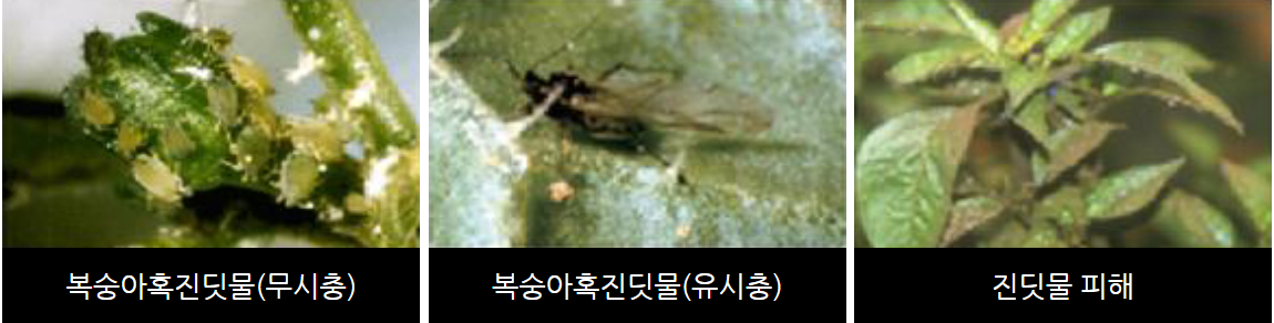 색깔을 변하게 하거나 생장을 저해하고 각종 식물바이러스를 전염시킨다. 발생초기 전용약제를 살포하고 진딧물 특성상 잎 뒷면에 서식하므로 적정 희석수와 약량을 작물전체에 살포 한다.