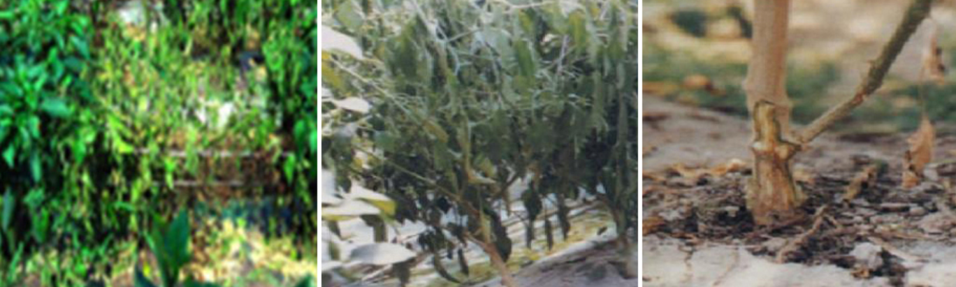 처음에는 생장점 부근의 잎이 수분 부족으로 급속하게 말라 시드는데 낮에는 시들고 밤에는 증상이 반복되다가 수일 내에 포기 전체가 푸른 채로 시들고 말라 죽는다.