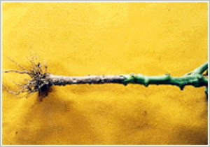 뿌리목은 수침상을 나타내면서 연화하여 줄기가 가늘어 지고 다습조건하에서는 점점 팽창하여 백색의 곰팡이가 생긴다.