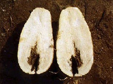 ☞ 붕소 결핍현상으로는 무를 잘랐을 때 속이 검은 색으로 변하거나 속이 빈 것이 있다.