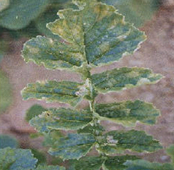 잎맥사이 흑갈색의 작은 무늬가 생기고 잎의 주맥을 중심으로 한쪽으로 오그라들어 상품성이 없어진다.