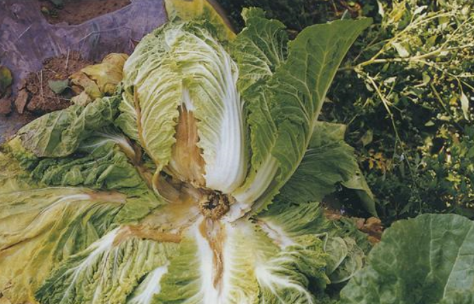 땅과 가까운 부분의 잎과 잎줄기에 처음에서 더운물에 데친 것 같은 무늬가 생기고 그 후 병무늬가 급격히 커지면서 조직이 무러지고 심한 악취를 낸다. 이병에 걸린 배추는 상품성이 전혀 없다.
