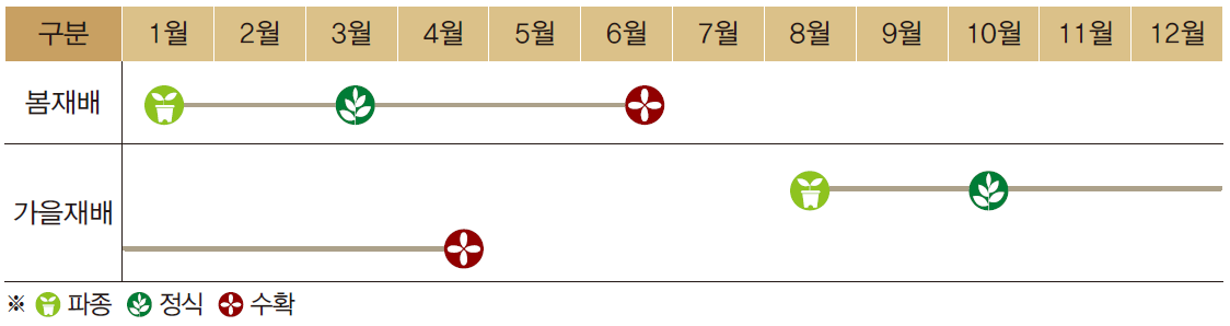| 고랭지 춘파재배 | 3월 상~3월 중 | 5월 상~5월 중 | 해발 600m이상 고지 | 만생종 |