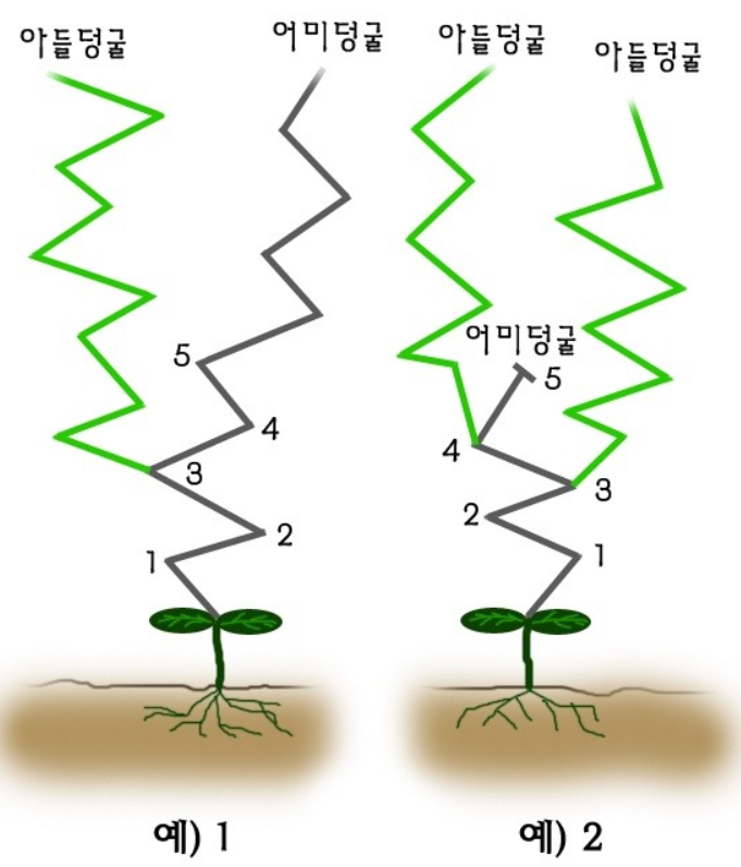 예2)의 어미덩굴은 5마디와 6마디 사이를 적심(자름)한다.
