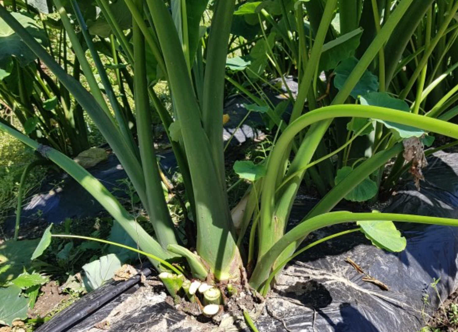 토란 수확시기를 맞아먼저 지상으로 나온 줄기를 잘라주게 된다.