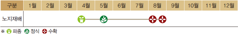 ● 토양 : 사토~양토까지 잘 적응하는 편이고, 인산이 결핍된 화산회토에서는 활착이 나빠 조기재배 불리함