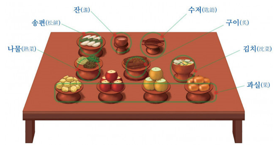 ・홍동백서(紅東白西) : 붉은 과일은 동쪽에, 흰 과일은 서쪽에 놓는다.