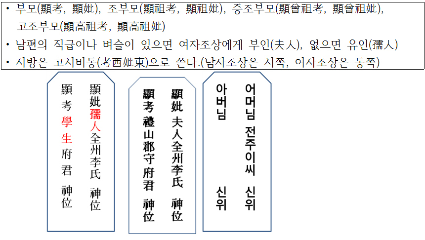 부모 한 쪽이 생존해 있을 때에는 단독으로 지내니 지방에도 한 분만 쓰지만, 두 분 다 돌아가신 경우에는 지방에 부모를 같이 쓴다. 고위(아버지)를 왼쪽, 비위(어머니)를 오른쪽에 쓰며, 한 분만 쓸 때에는 중앙에 쓴다. 지방에는 고인과 제주의 관계를 적고, 고인의 직위와 고인의 이름을 적은 뒤 마지막에 '신위'라고 적는다.