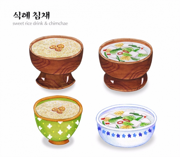 이러 삼색나물과, 청강(간장), 침채(흰나박김치), 식혜를 놓는다.