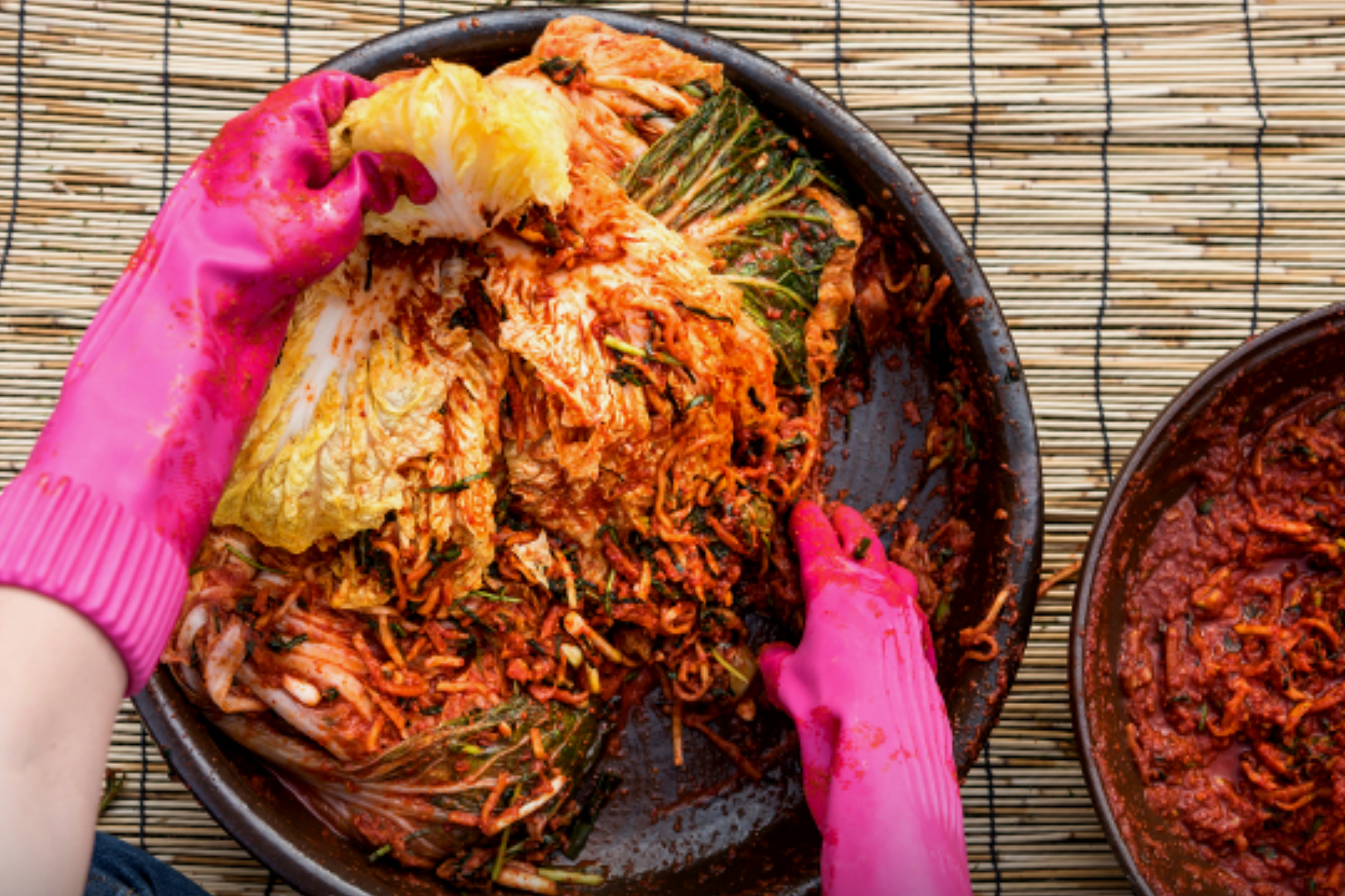 3. 무채 750g에 간 무 1.5kg, 고운 고춧가루 170g을 넣고 색을 입힌 뒤 간 채소, 식힌 찹쌀풀 500g, 고춧가루 230g, 멸치액젓·소금 각 70g, 멸치젓·새우젓·대파 각 50g, 간 생새우 100g, 매실청 300g, 양파∙쪽파∙미니라 각 100g, 홍갓 150g을 넣고 버무려 김장김치 양념 만들기(5포기 15kg 양념비율)를 완성한다.