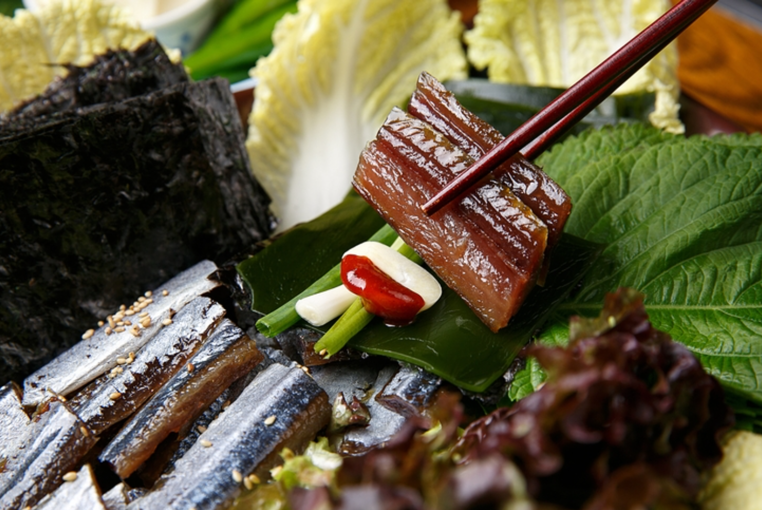 3. 김 위에 미역·껍질을 벗긴 과메기·초장·잔파·마늘·배추·고추를 얹어 쌈을 싼 뒤 한 입에 쏘옥~. 술을 좋아하는 사람들은 소주와 곁들여 먹으면 더욱 좋다.