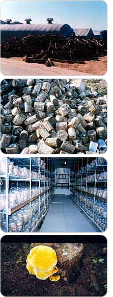 6) 원목 표면에 하얗게 종균이 활착된 상태에서 하우스 안으로 옮겨 깨끗한 흙에 반정도 묻고 적당한 수분을 유지시키면 몇 개월후 흙으로 덮히지 않은 부위에서 노란 상황 버섯이 발생한다.