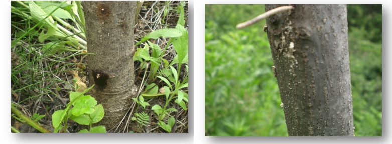 -3년 이하의 유목에 많이 발생하며, 나무둘레를 원형으로 파먹는다.