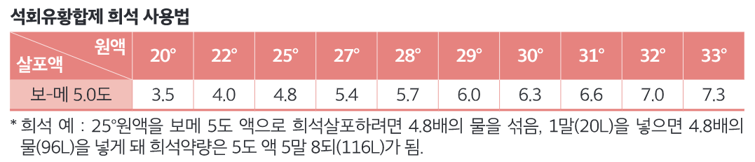 약량은 원랙 18l에 물 400~600l까지 희석하는데 살포 시기가 늦어질수록 물의 양을 늘려야 한다.