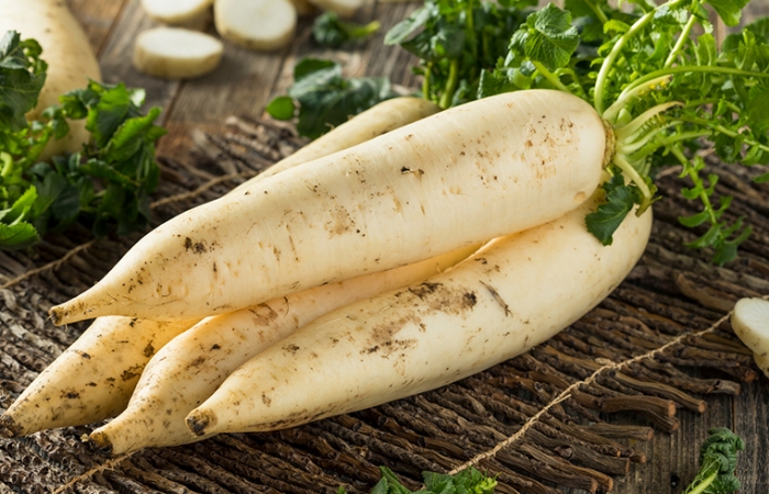 무는 가래를 해소하는데 효과가 크다. 기관지가 약해서 가래나 기침을 많이 할 때 좋다. 무를 적당히 썬 후 믹서에 갈아서 하루 2~3번 마시면 된다.