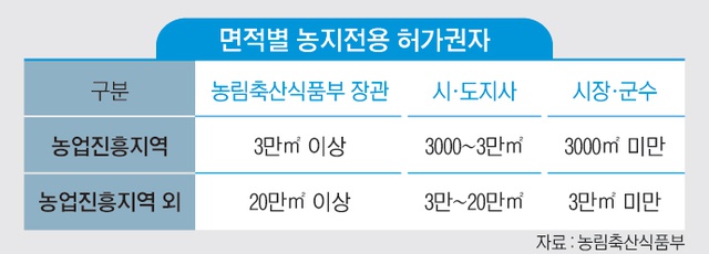 농지전용의 허가는 농업진흥지역 안의 농지인지, 밖의 농지인지와 해당 면적에 따라 허가권자가 결정된다. 만일 농업진흥지역 안의 농지이며 면적이 3천㎡이상이라면 농지전용 허가결정은 해당 관할 시·도지사가 된다.