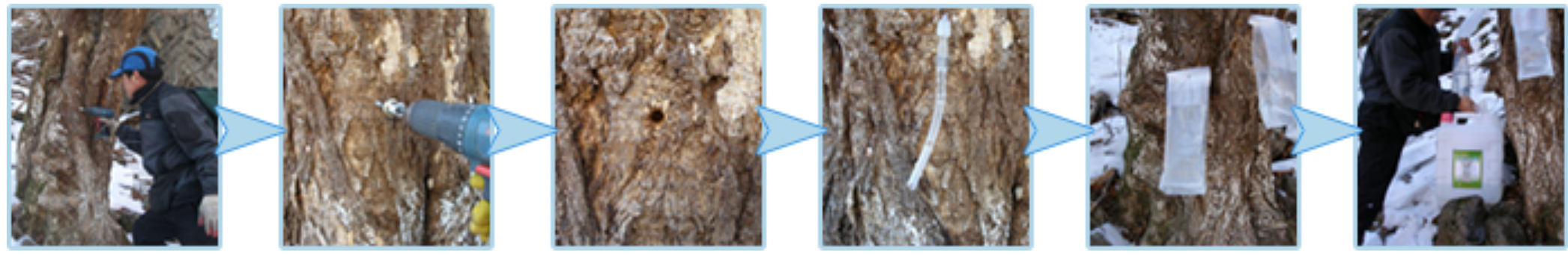 뚫은 구멍에 수액 유출기(플라스틱 주사바늘)를 부착해 수액을 채취한다. 수액채취가 끝나면 유출기와 연결선을 모두 제거하고 구멍을 뚫었던 자리에 유합촉진제(디오판도포제)를 발라서 부후균의 침입을 방지하고 유합을 촉진시킨다.