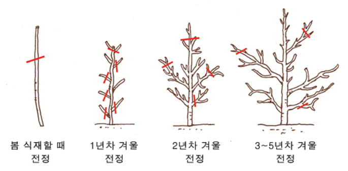 분지각도가 넓은 주지후보지를 많이 양성하고 수관을 조기에 확대시키며, 왕성한 수세를 유지시키기 위해서 주간형으로 키워 나아가 한다. 묘목을 심은후 3월 하순에 그 길이의 1/3을 절단하여 70-90cm가 되게한다. 묘목이 너무 가늘고 빈약한 것은 30cm만 남기고 잘라주어 1년을 다시 키운다.