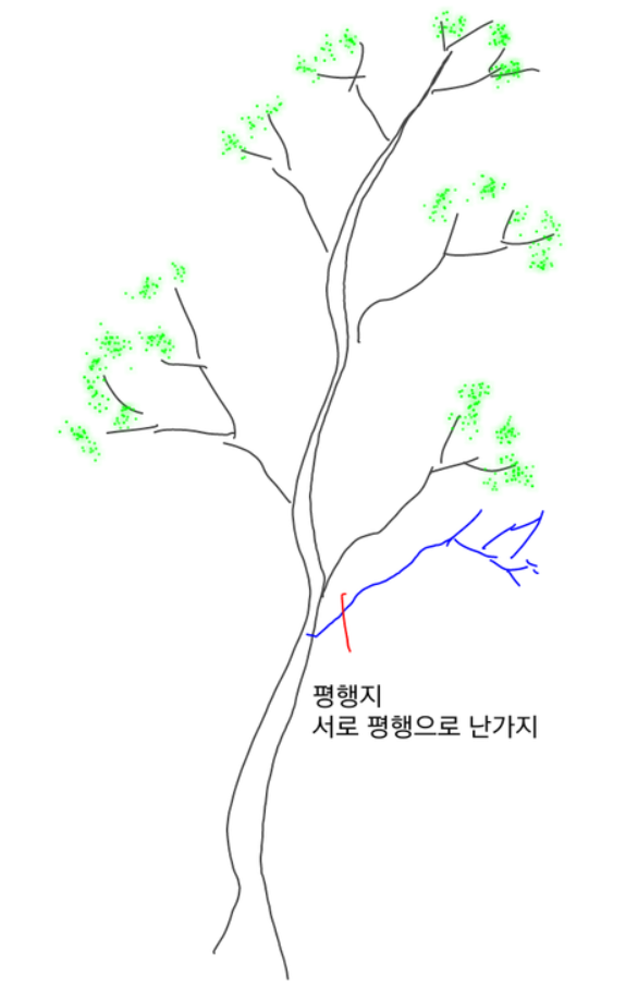 평행지(平行枝): 위 아래로 나란히 자란 가지