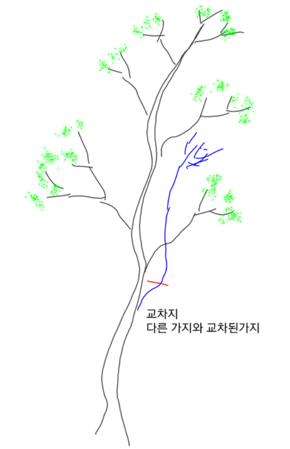 교차지(交差枝): 두 개의 가지가 서로 엇갈리며 자란 가지