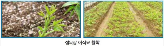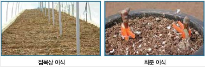 접목 후 이식: 접목이 완성되면 온실 내 접목상이나 화분 등에 이식하고 지속적으로 맹아 및 잡초를 제거해줍니다.