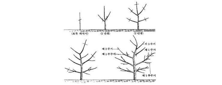 묘목을 심은 후 3∼4 년생까지는 매년 3∼4개의 주지후보지를 30㎝간격으로 두며, 후보지 이외의 가지 중 후보지에 방해되거나 밀생된 것은 제거하고 나머지는 남겨 두어 나무의 생장을 돕는다. 원가지(主枝)는 가지의 발생위치·각도 등을 고려하여 3∼4개의 永久主枝를 선정하는데, 제 1 주지는 지상으로부 1.2∼1.5m, 그 다음부터는 0.8∼1m간격으로 서로 방향이 어긋나게 붙인다. 임시주지라 하더라도 영구주지에 방해되지 않는 한 5∼6개 남겨서 결실에 이용하다가 점차 제거한다.
