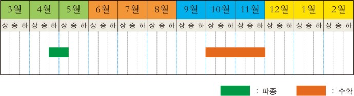 남부지방 파종시기(심는시기): 4월상∼하순. 보통재배에서는 늦서리로부터 대략 10일전쯤에 심는다.