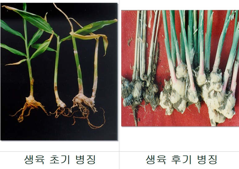 6월부터 8월에 걸쳐서 발생하는 병으로 특히 다습할 때 근경의 지제부가 황갈색의 수침상으로 부패하는 것이 특징이며 소생강 보다는 대생강에서 심하게 발병한다.