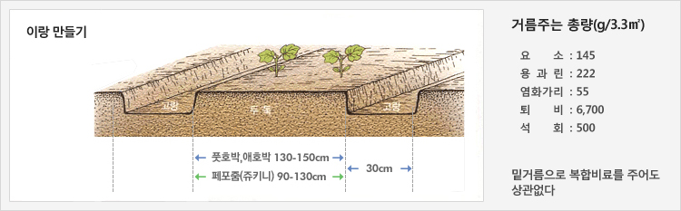 상기 시비량 중 인산비료는 전량 밑거름으로 주고 질소질비료와 칼리비료는 40%만 밑거름(기비)으로 주며 나머지는 3∼4회 나누어 주는 것이 놓다.