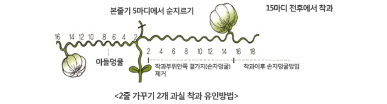 덩굴의 14∼18마디에 암꽃이 착생한 후 4마디에 2번째 암꽃이 달린다. 어미 덩굴과 2-3개의 아들덩굴을 기르거나 어미덩굴을 정식하기 전에 순지르기 하여 아들덩굴 3-4개를 키운다.