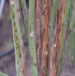 - 처음에는 줄기를 따라 타원형의 연한 갈색 병반을 만들고 주위가 수침상으로 되어 넓게 번지며 줄무늬가 나타나고. 후에 병반 중앙 부위에 검은색의 작은 반점을 형성하며, 병반이 크게 되면 줄기를 둘러싸서 마른다.