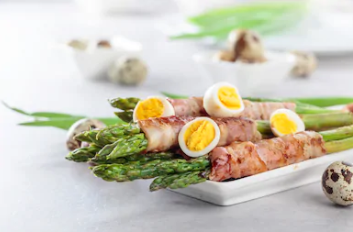 깨끗하게 손질한 아스파라거스 밑동을 약간 잘라 감자필러로 껍질을 살살 벗긴다. 끓는 물에 소금을 약간 넣고 데친 다음, 아스파라거스 물기를 제거한다. 베이컨을 준비해 아스파라거스 줄기를 돌돌 말아 고정한다. 프라이팬을 예열한 뒤 열기가 오르면 기름이나 버터를 두른 다음 프라이팬에 살짝 굽고 후추로 간을 한다.