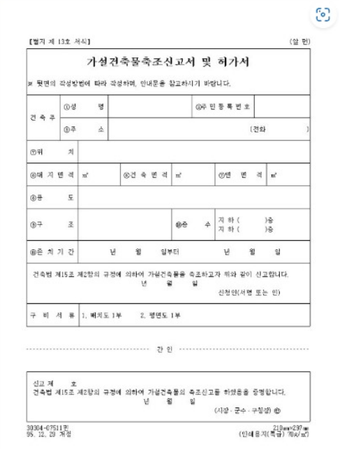 가설건축물 축조신고서 양식은 해당 자자체에 건축민원과에 상시 비치되어 있다. 작성할 때 주의 할 점은 농막존치기간으로서 한번설치하면 반 영구적으로 사용할 수 있는것이 아니라 3년마다 연기를 하여 지속적으로 사용을 하여야 한다.