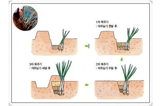 북주기를 하는 이유는 파가 쓰러지는 것을 방지하는 것과 연백부를 길게함으로써 품질을 높이는 것이다.